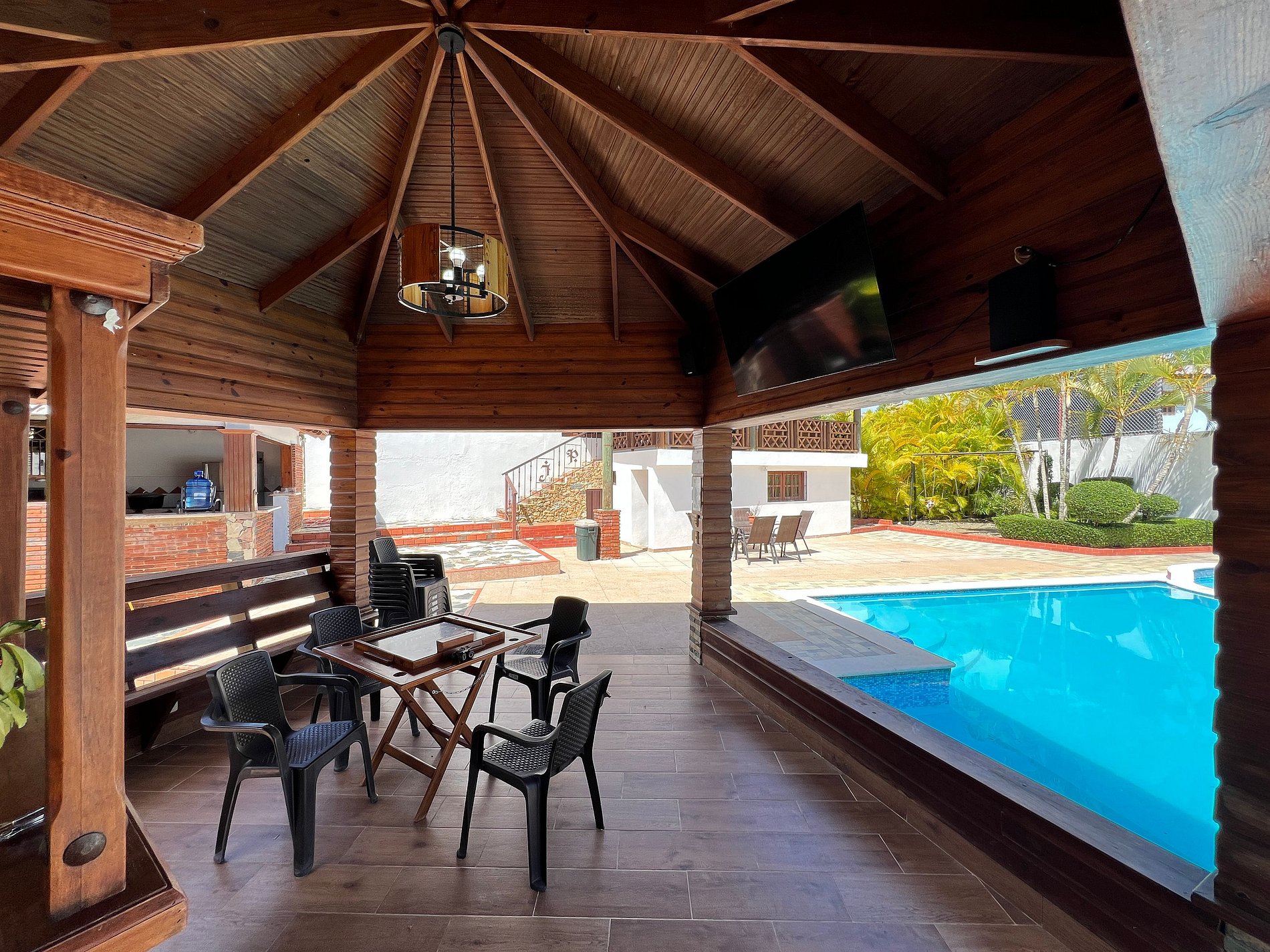 - Gazebo with Smart TV and furnished bar area beside the pool.