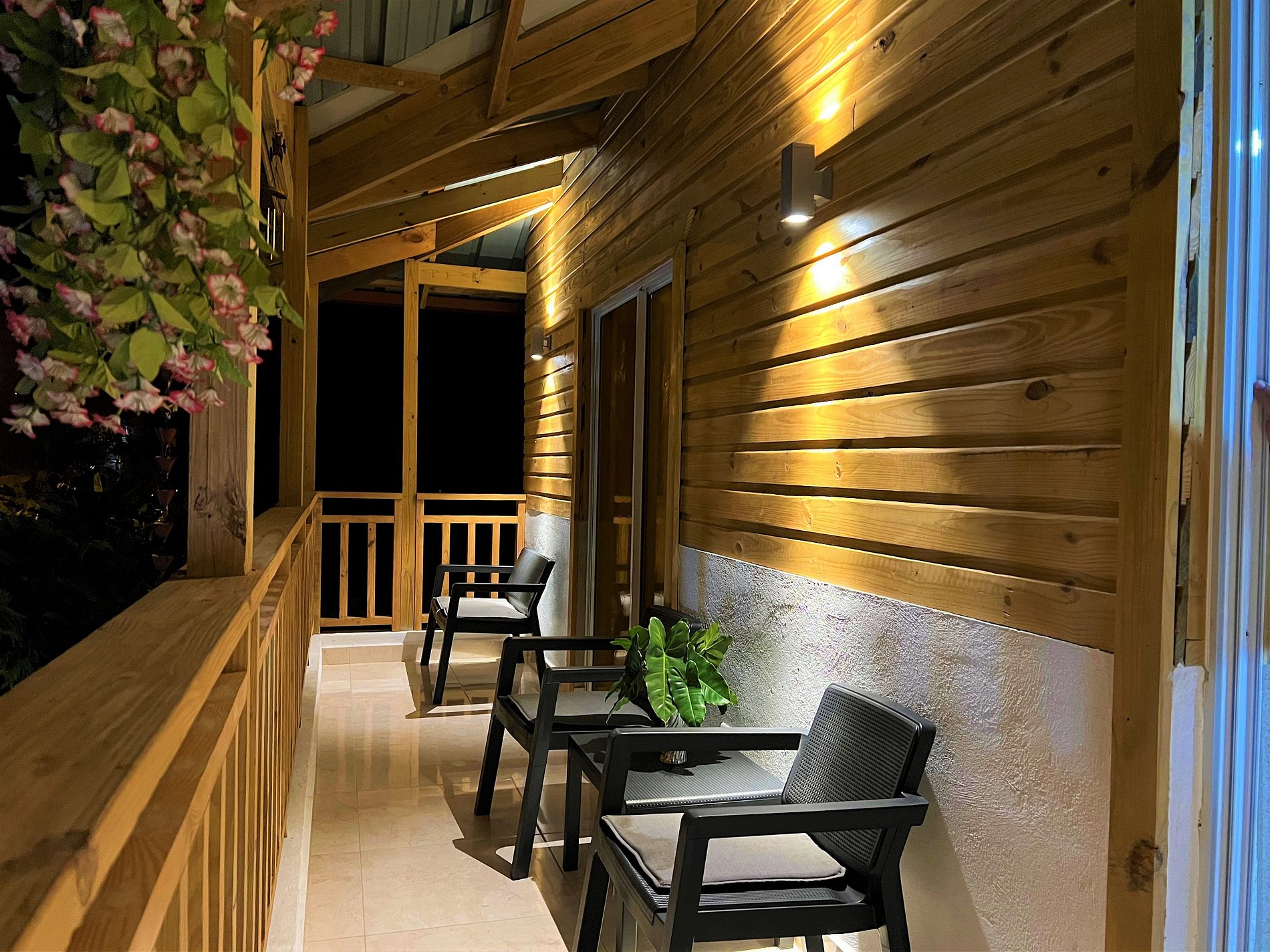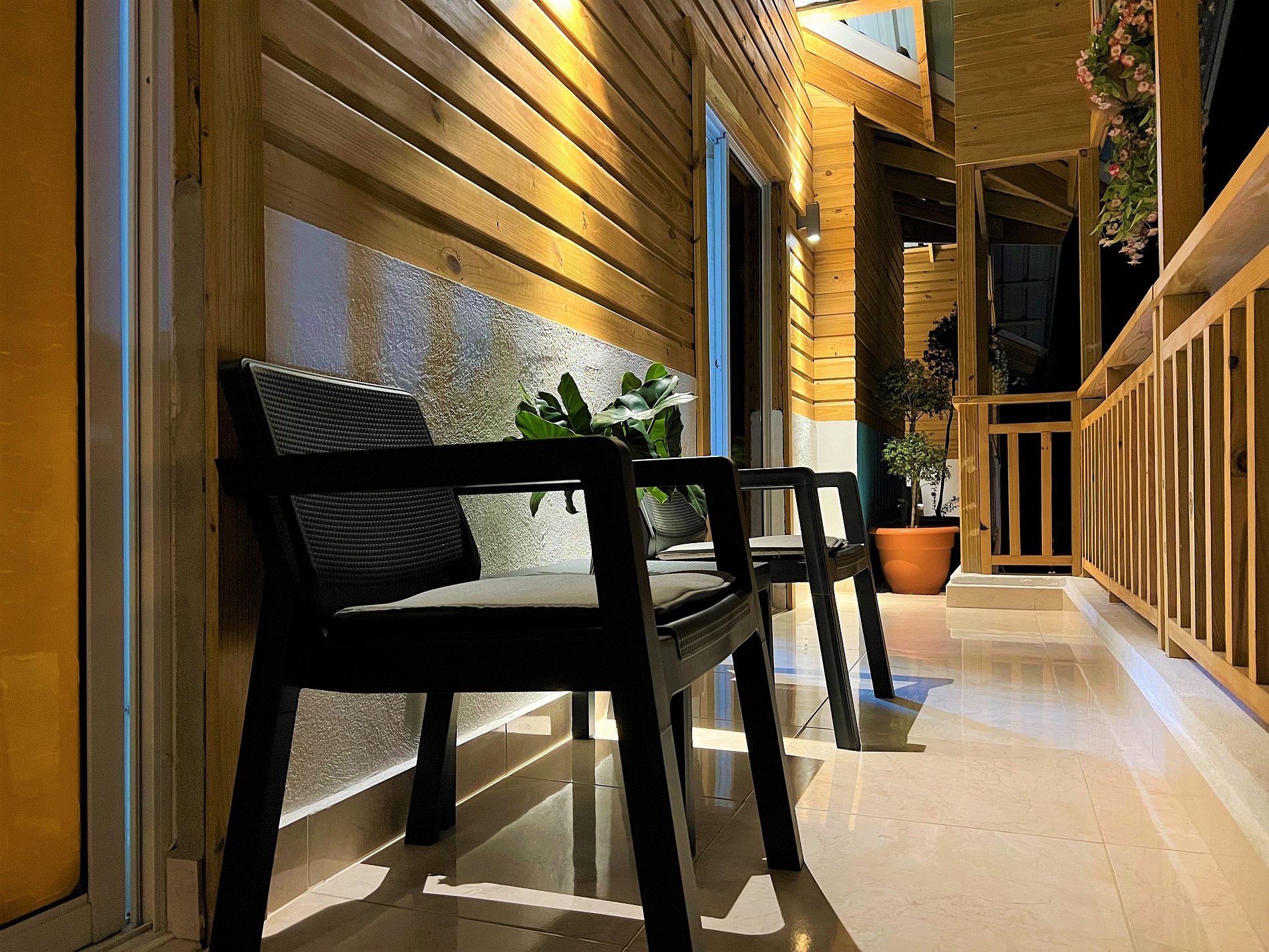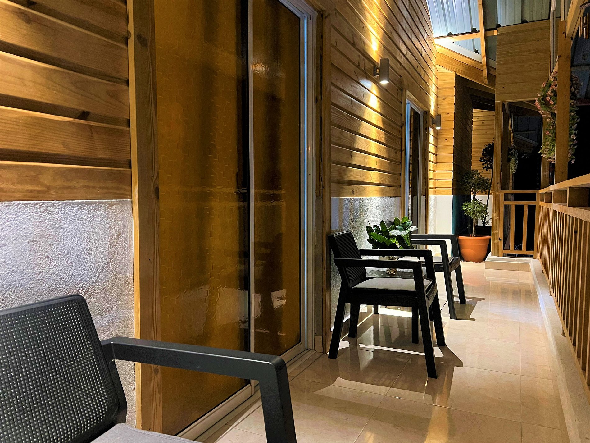 The balcony has outdoor furniture to enjoy the sunset in the mountains and breathe in the fresh air.