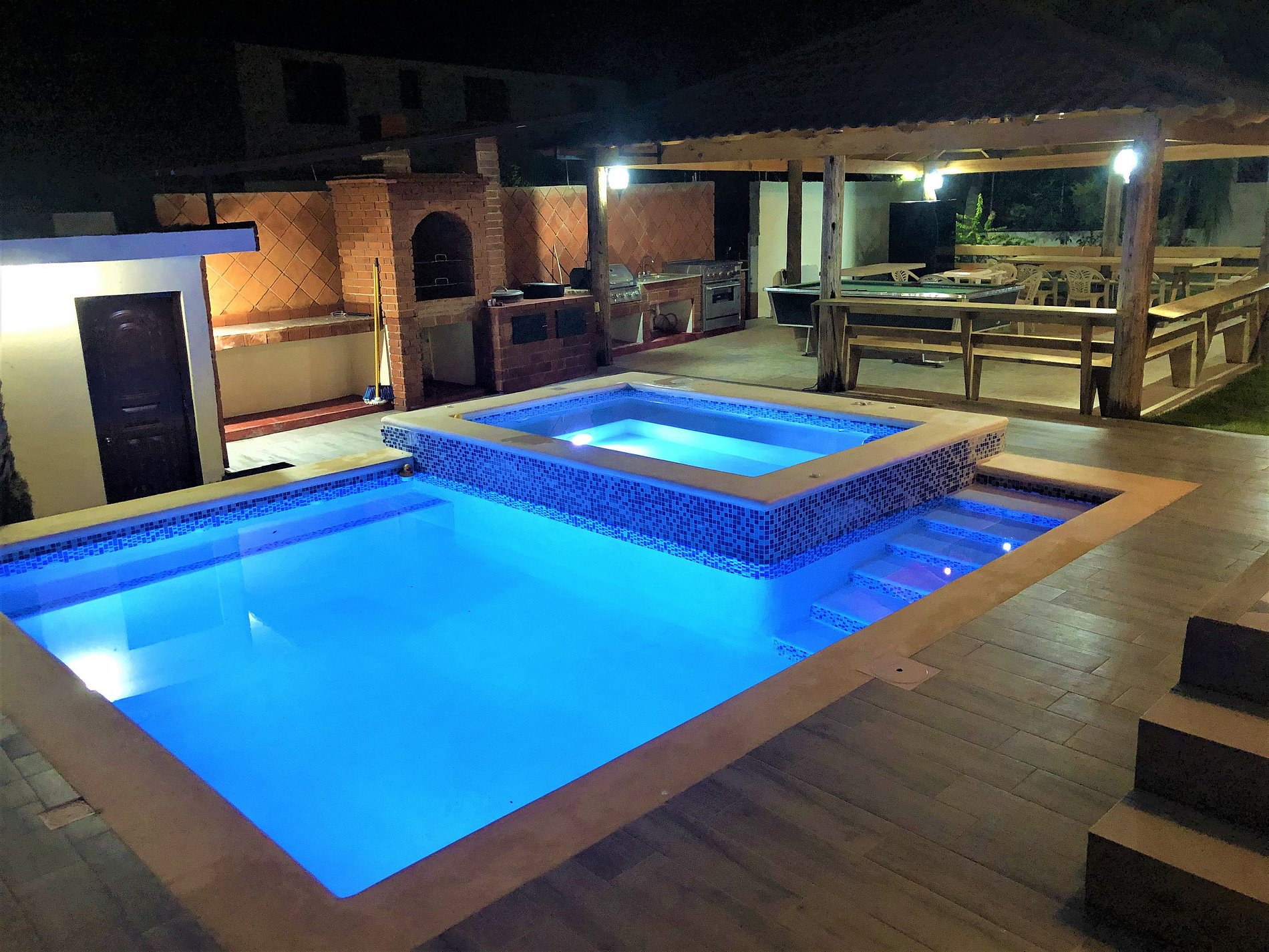 Cuenta con un espacio muy amplio, excelente para realizar eventos como bodas, cumpleaños, etc.; tiene gazebo, lorena, mesa de billar, piscina, jacuzzi, bar, dominó, patio, jardines, estacionamiento amplio, 4 dormitorios, 2 salas, cocina, 5.5 baños, balcones, TV y Wifi.