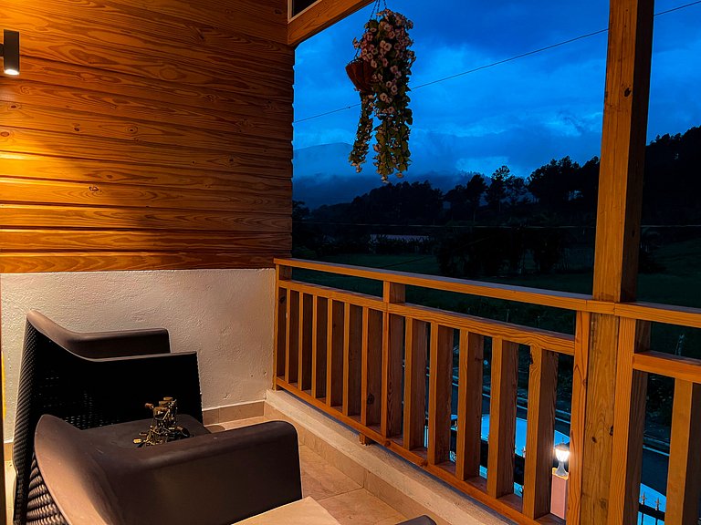 El balcón dispone de mobiliario exterior para disfrutar del atardecer en las montañas y la casa cuenta con diferentes amenidades que enriquecerán su estadía.