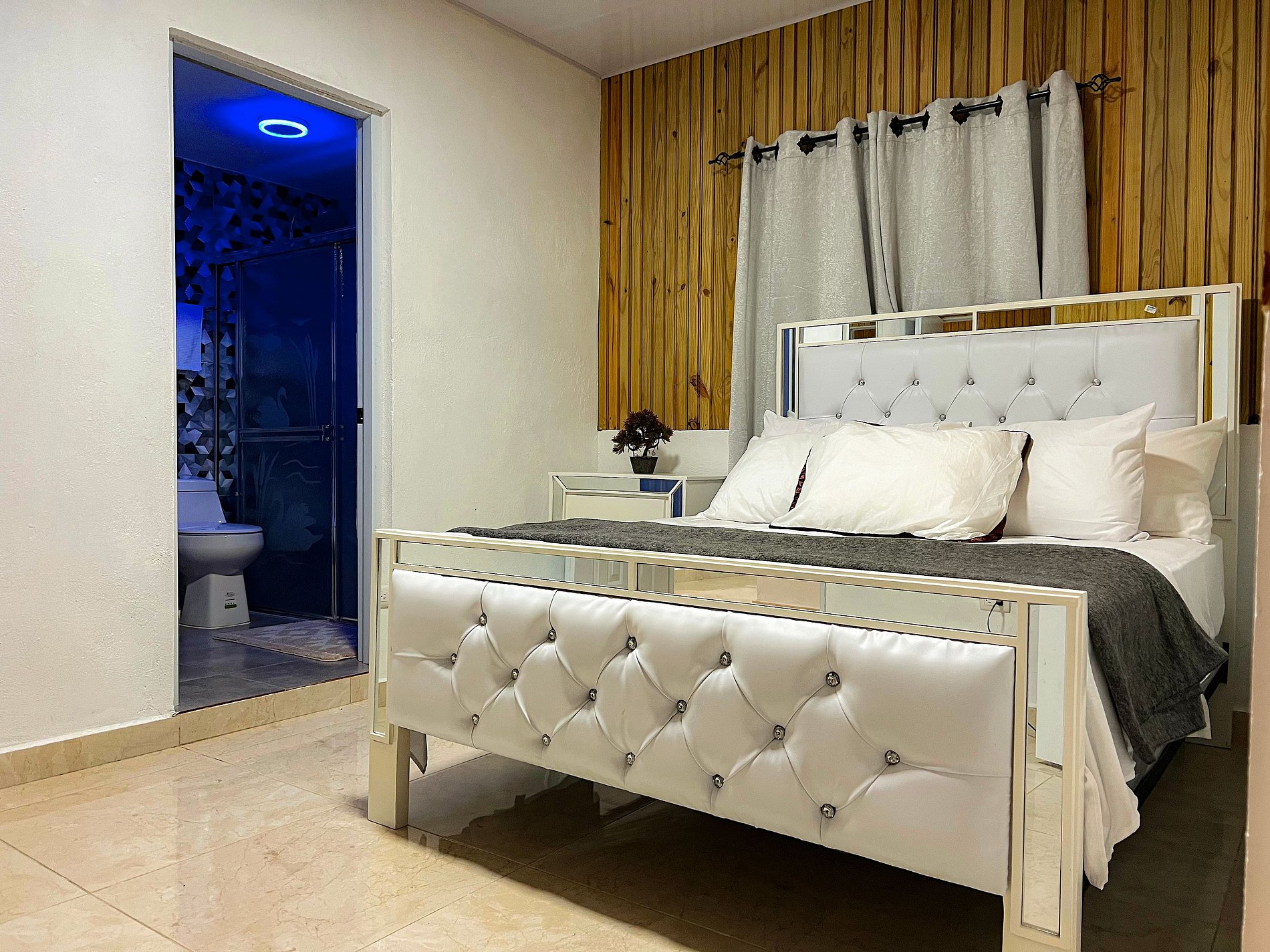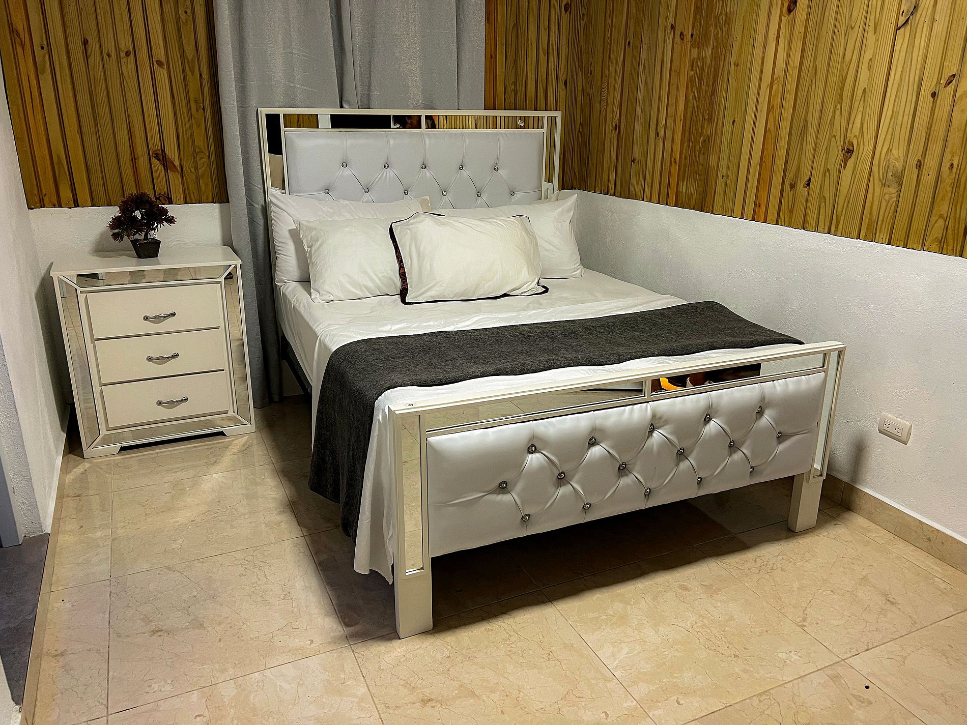 Consta de 3 habitaciones, 1 con baño privado, así como una cama matrimonial en cada habitación, con sus sabanas y accesorios de cama.