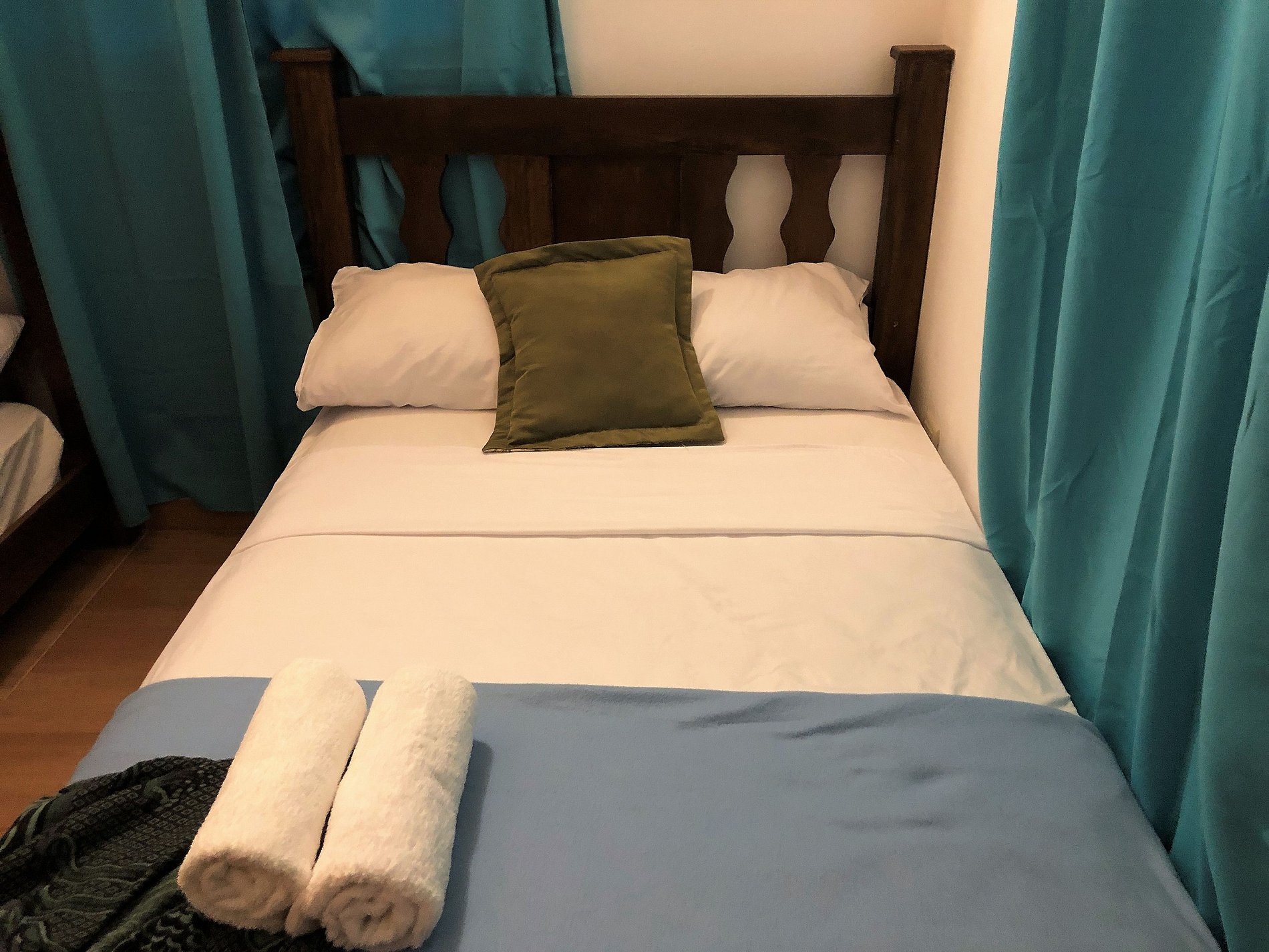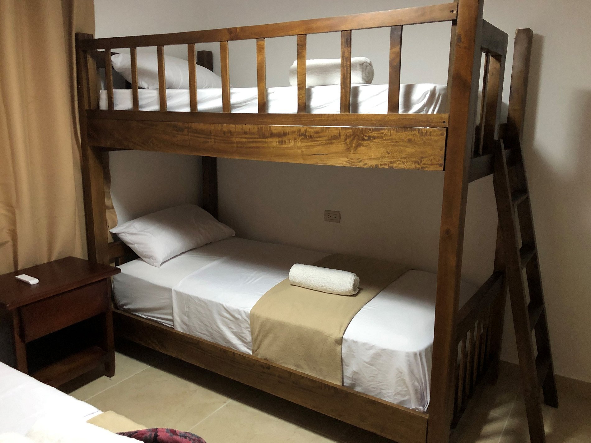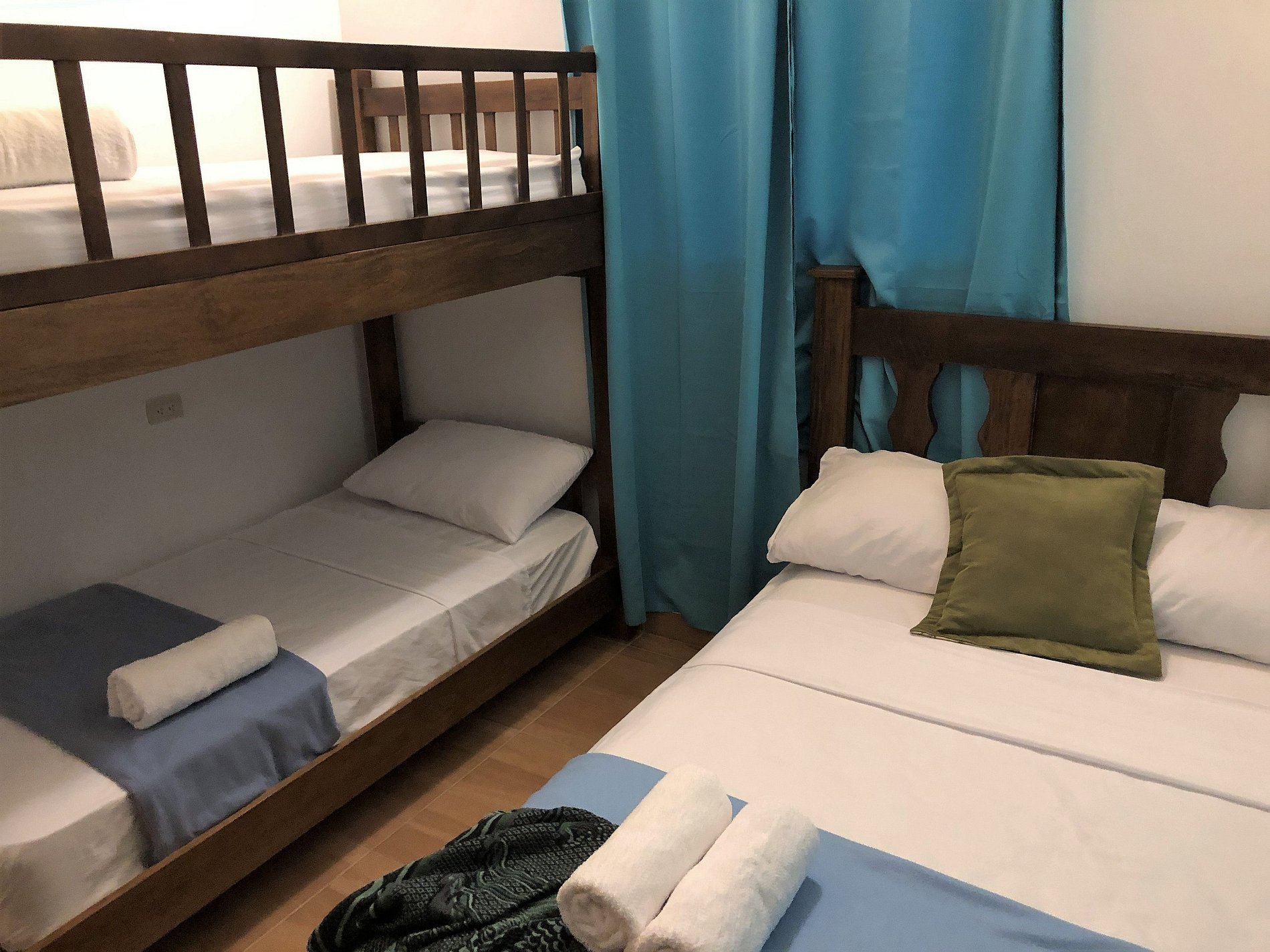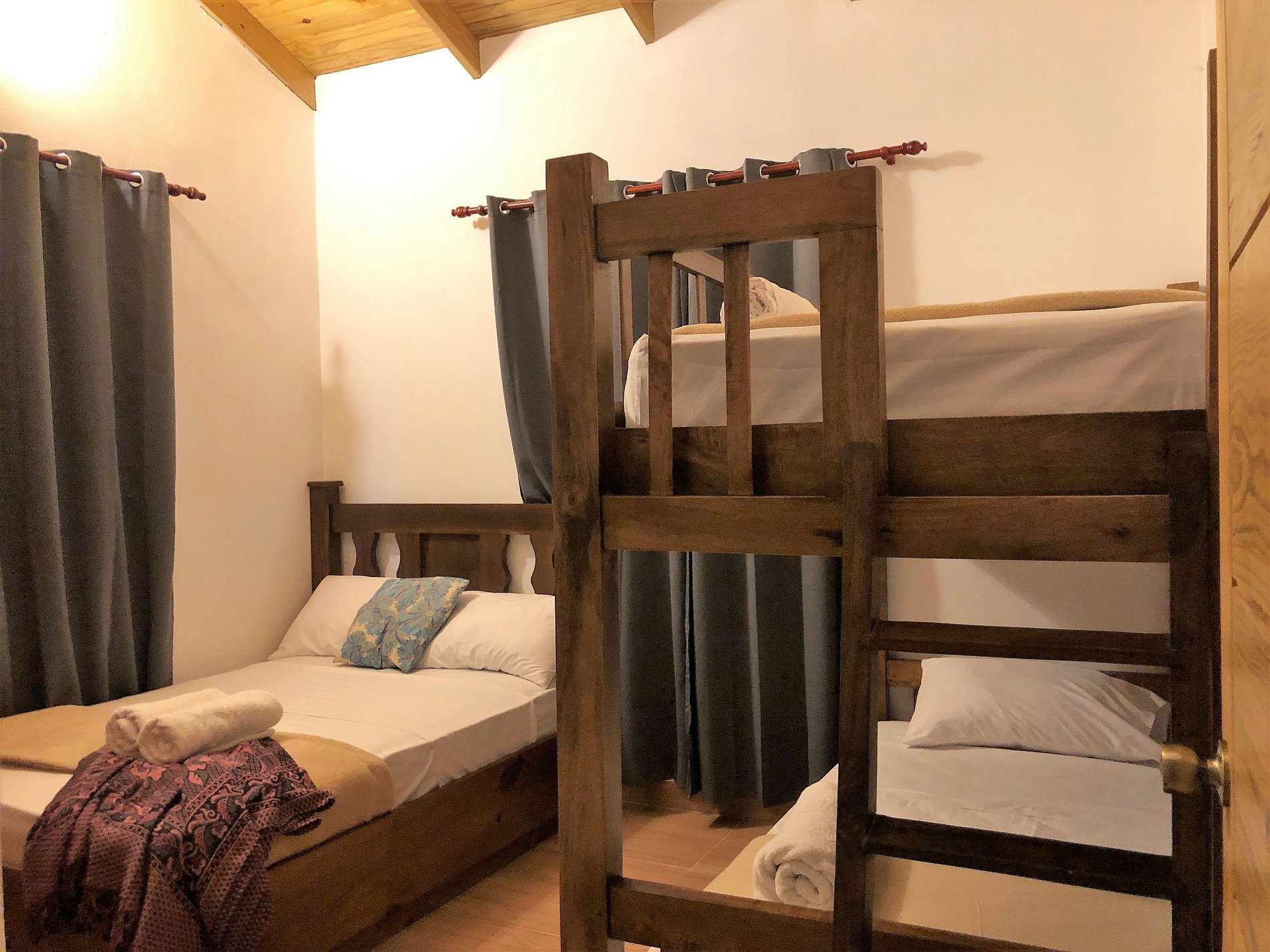 —Segunda habitación: Ubicada en la segunda planta, esta habitación consta de un mobiliario sencillo, pero cuenta con bastante espacio para distribuirse en una cama matrimonial, un camarote para 2 personas y su armario.